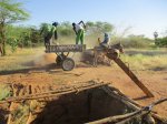 Auch hier kommt der ENMIGRAW Eselskarren der Frauen zum Zuge. Mit ihm werden Sand und Steine an die Baustelle geführt, damit die fertigen Stützringe hinterfüllt werden können.